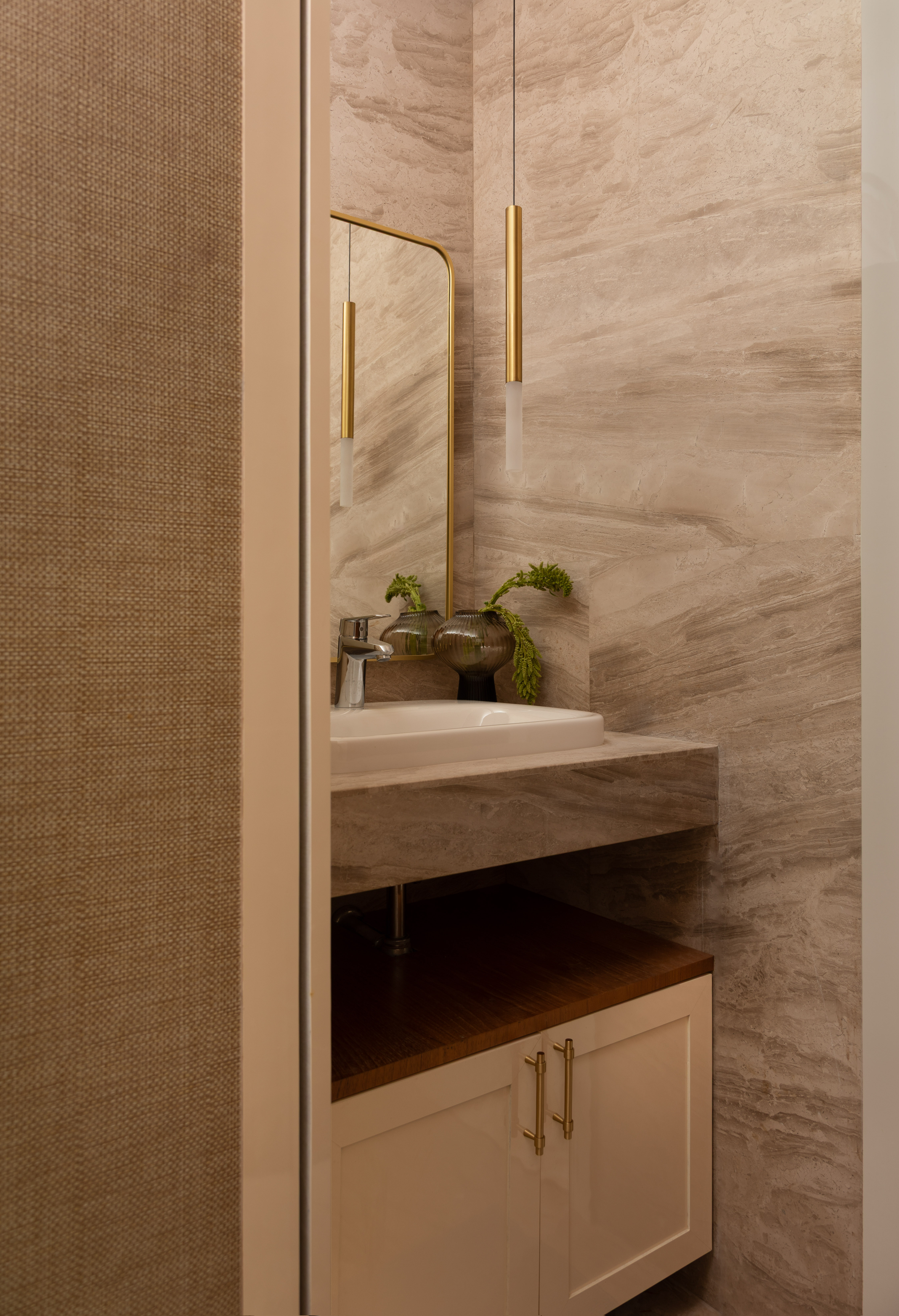 The bathrooms, extensions of the attached bedrooms, take a functional, contemporary approach with storage units and shelves, the finishes of which complement the beautiful marble shell with light fixtures and brass accents bringing in a touch of luxury.