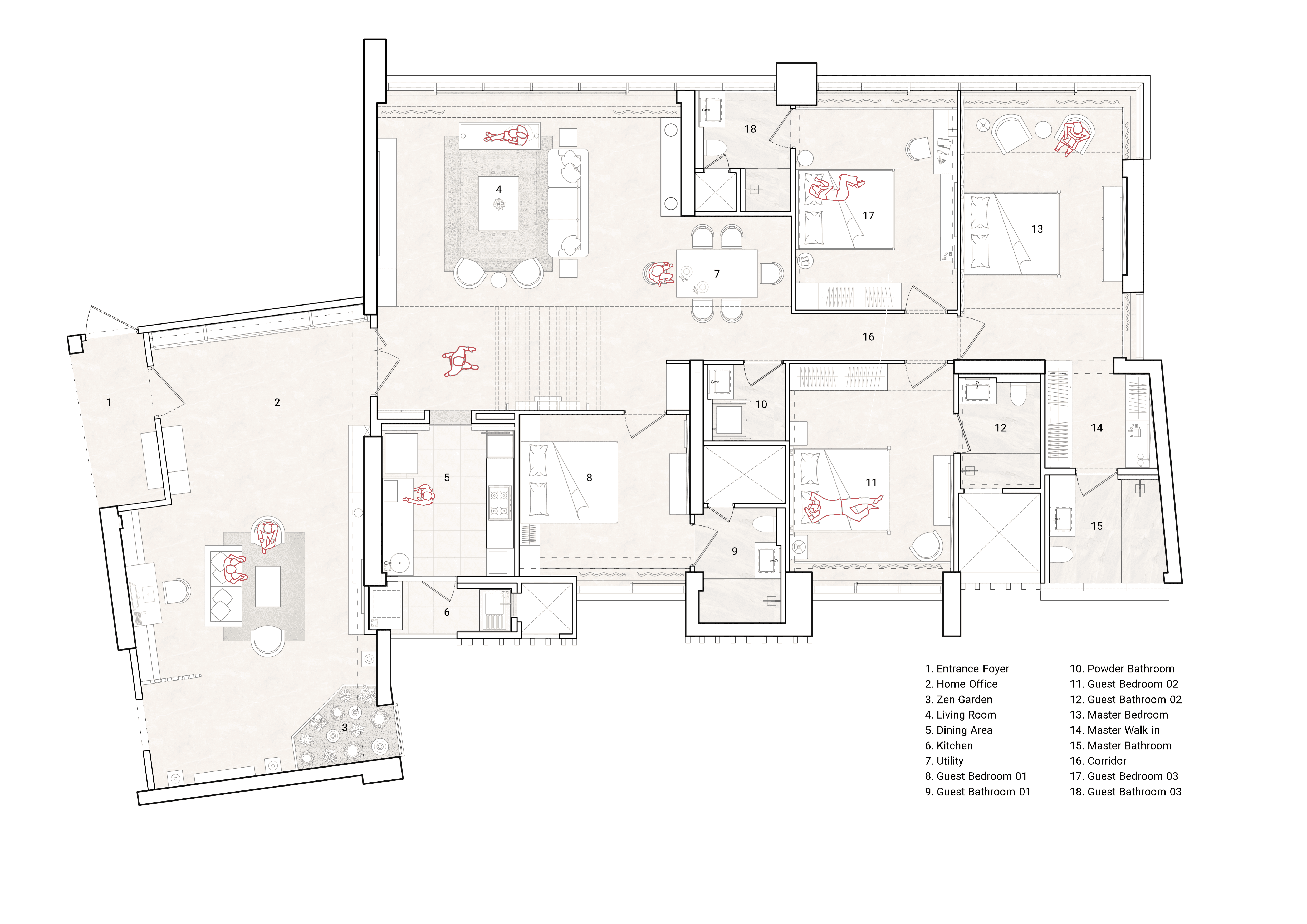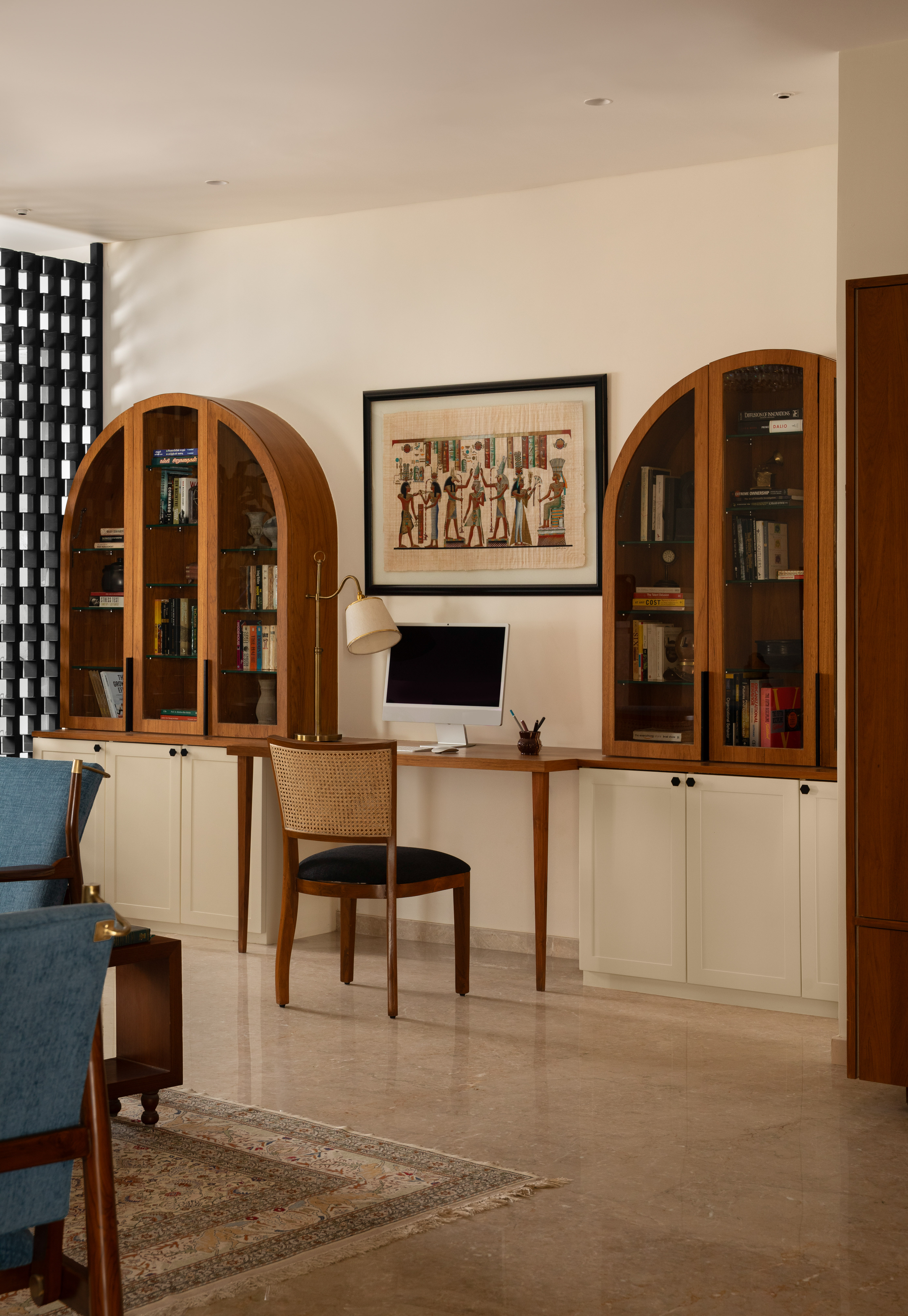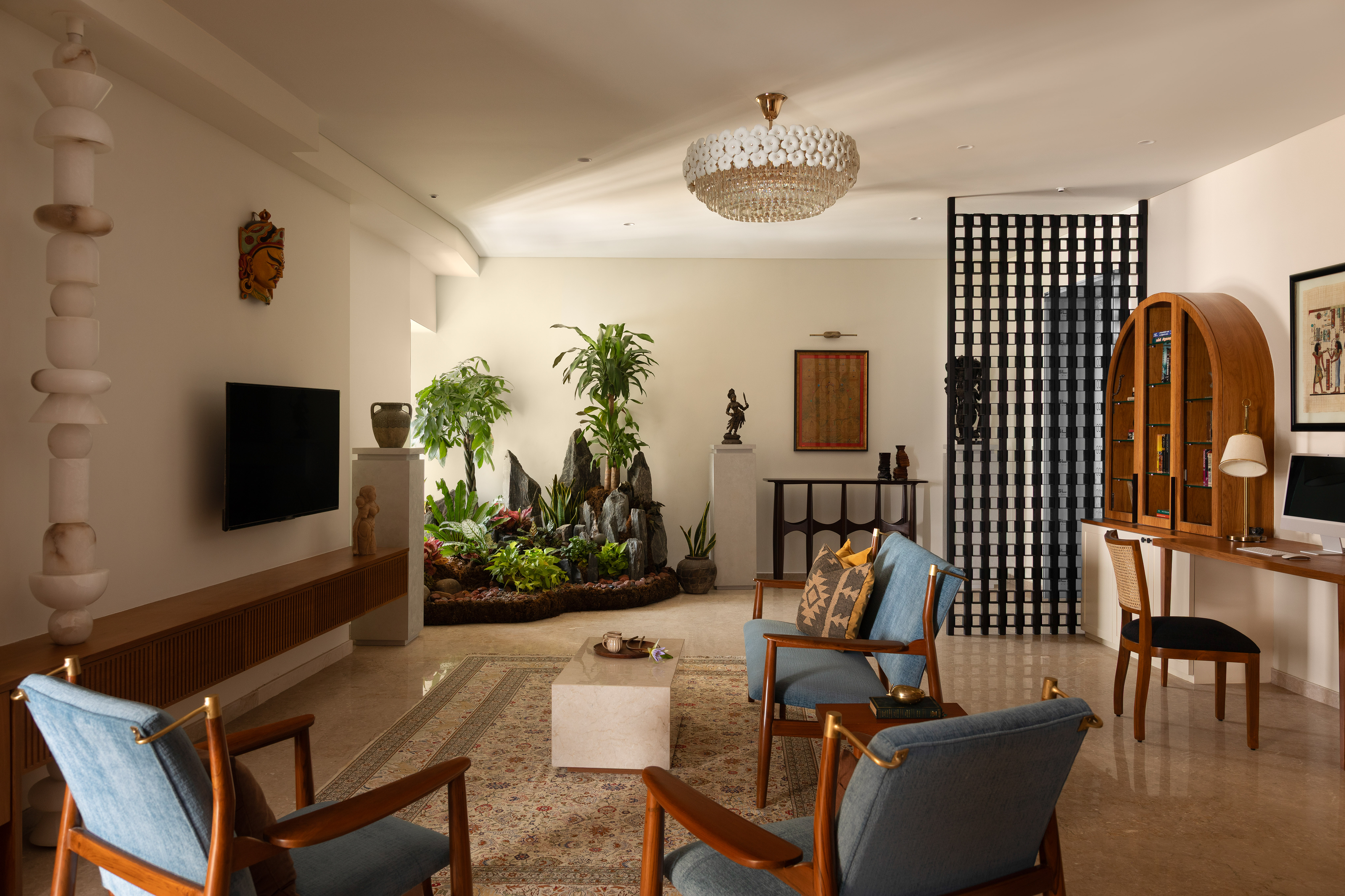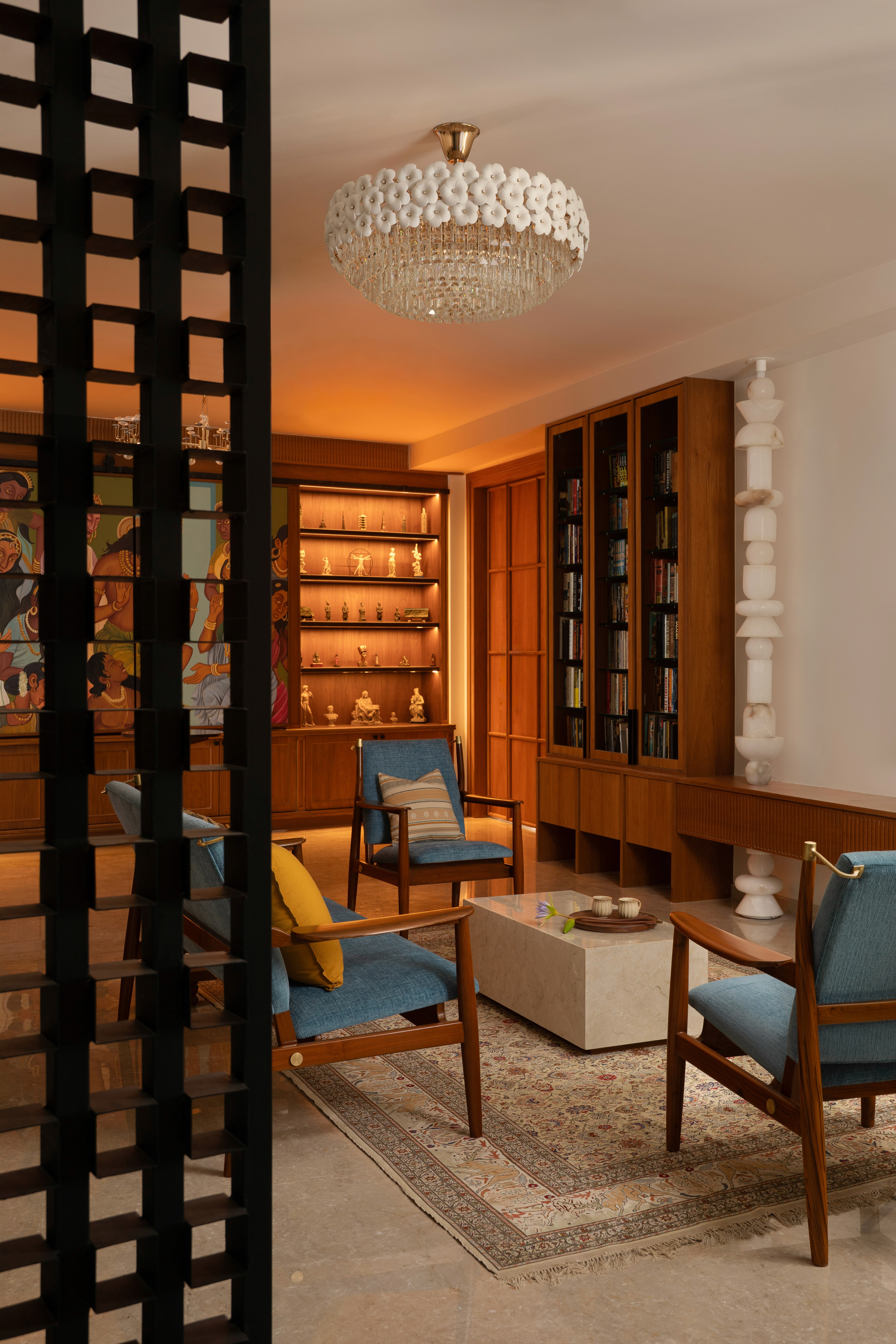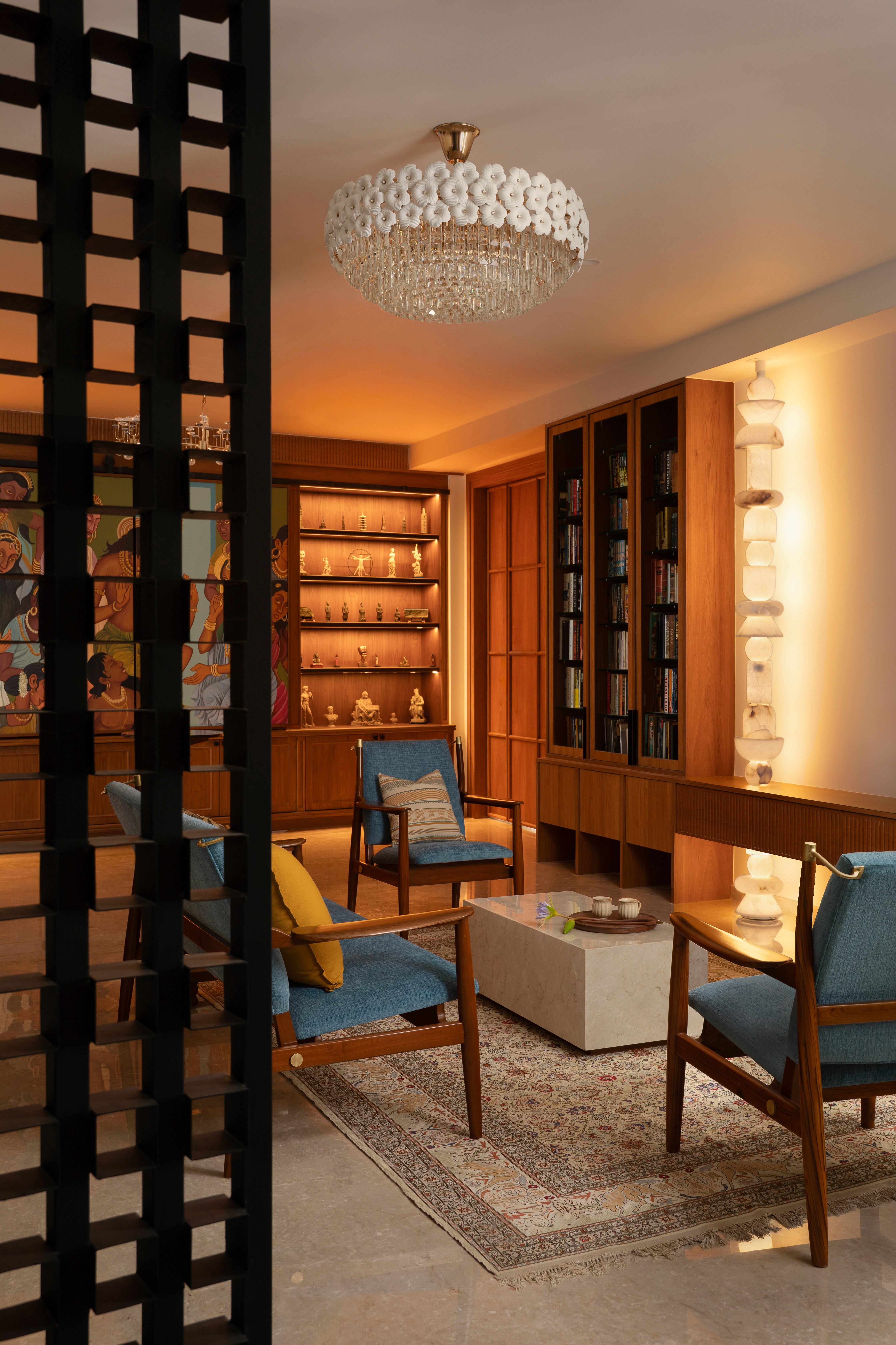 The home office is an eclectic space where the client is enveloped by artefacts and books, collected along their travels, held within a warm wooden shell with black accents. A customised sliding artwork, the nucleus of the room, is a modern-day interpretation of an Ajanta-Cave painting. A stunning custom full height alabaster totem light, a tall geometric metal screen, a corner Zen Garden are few elements that give the space its unique character. Nestled amongst it all is a calm study unit for the client.