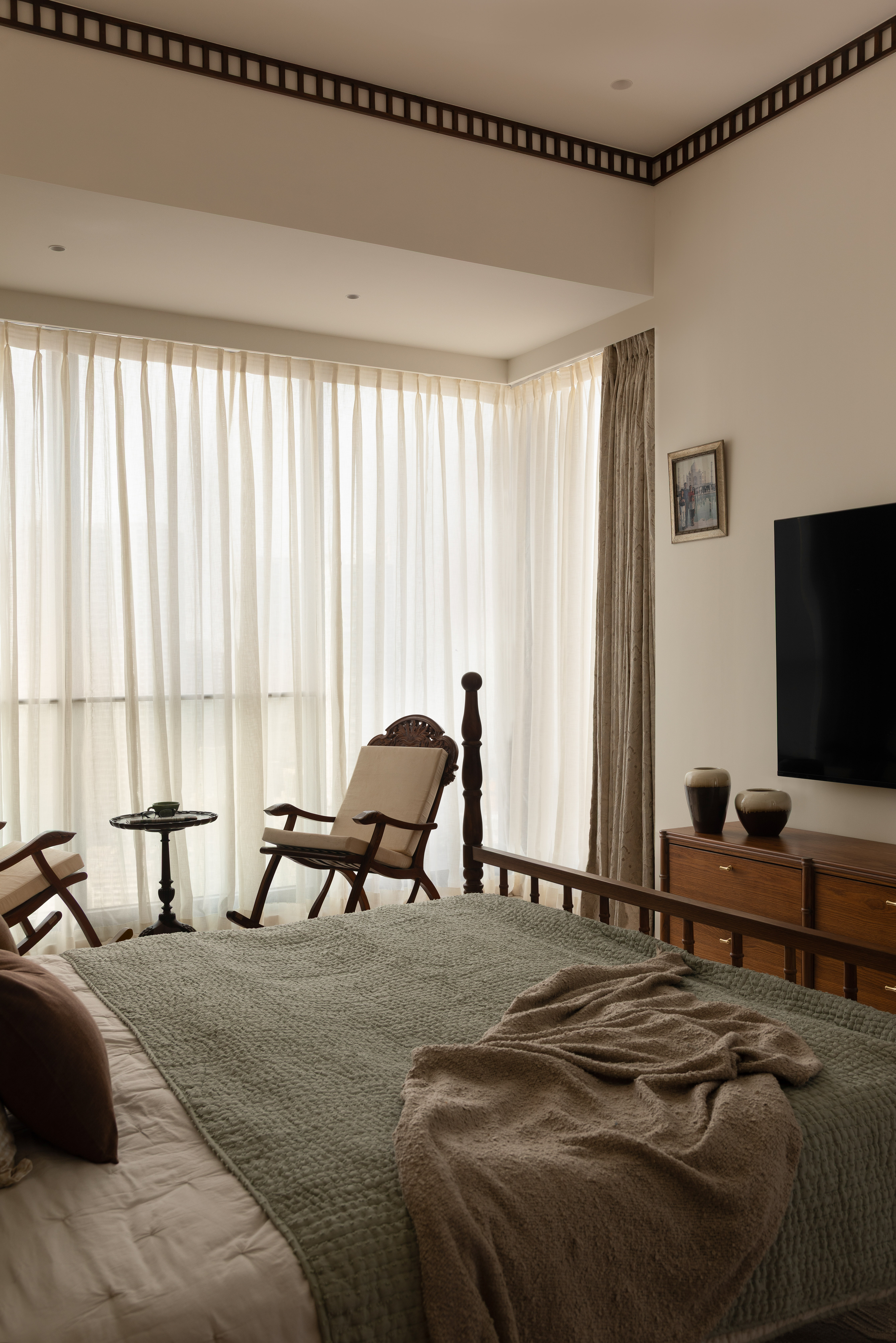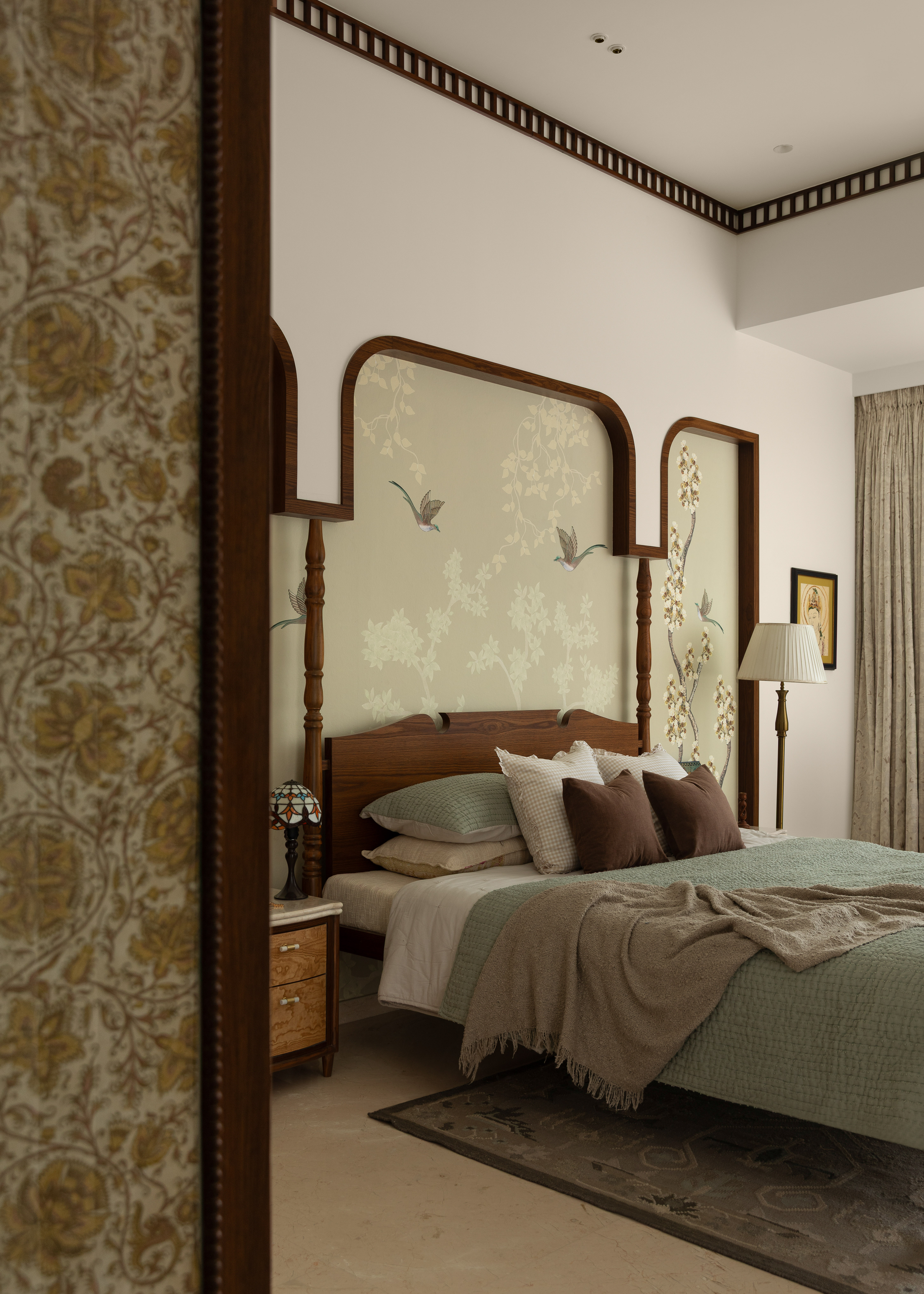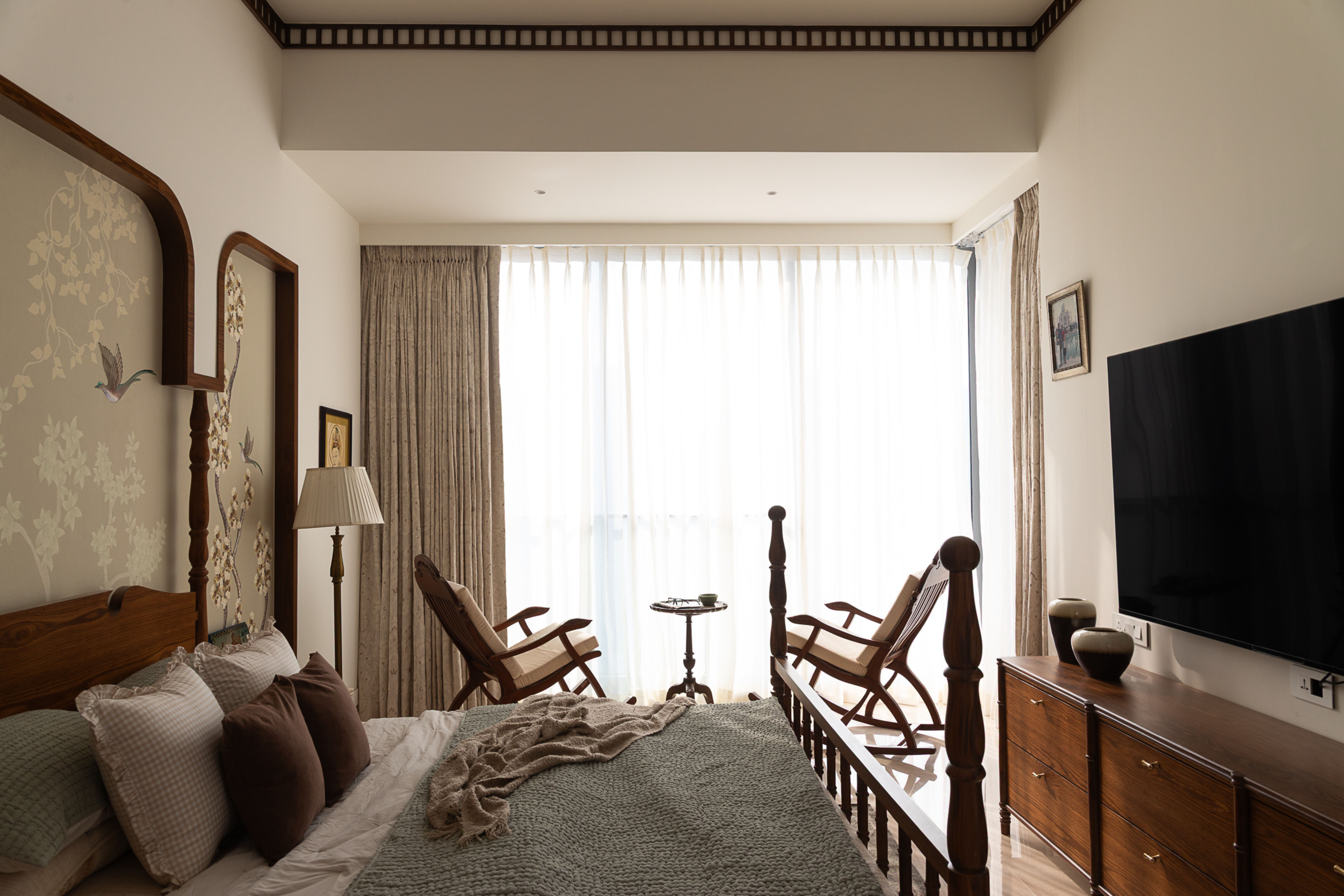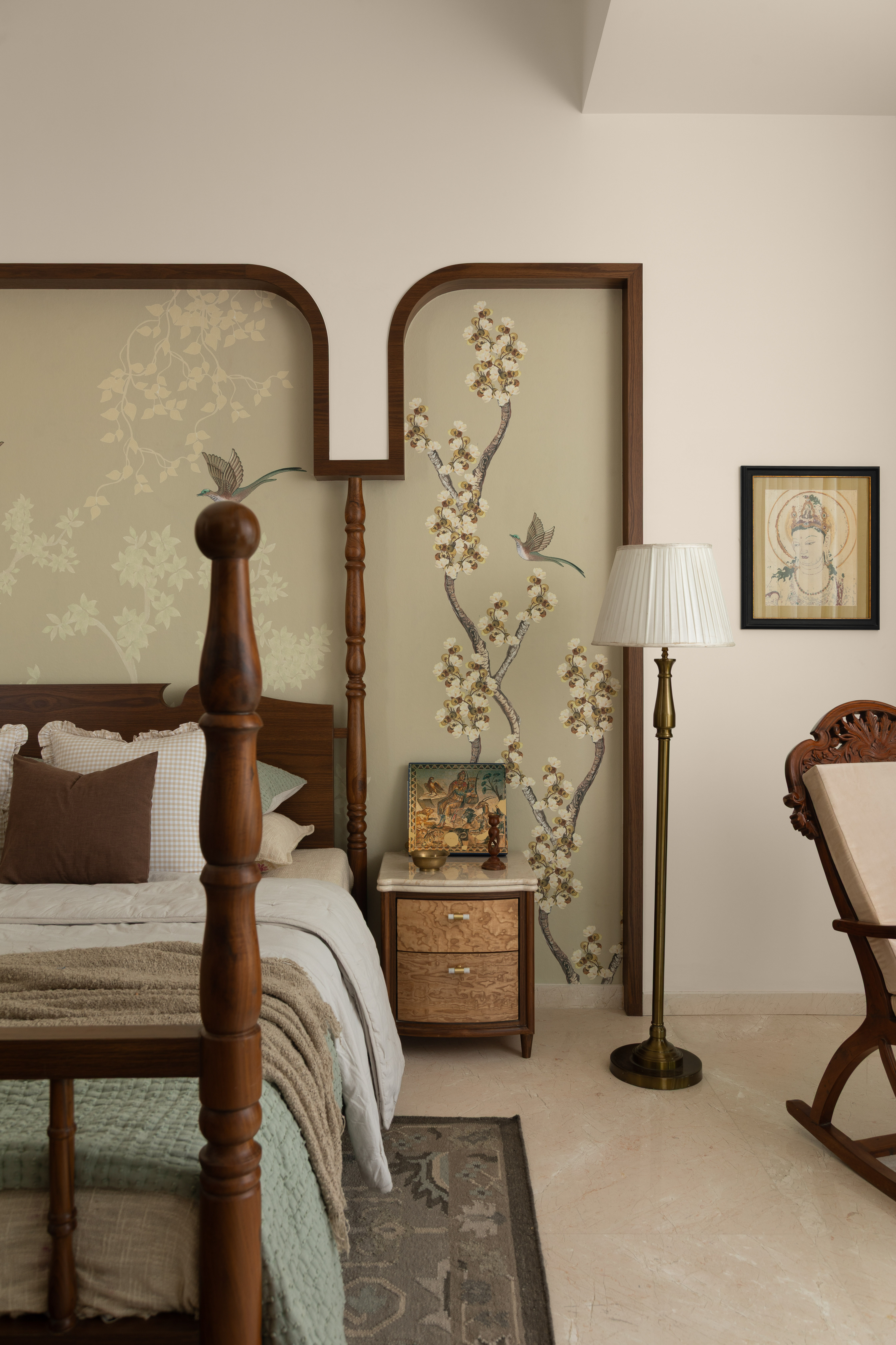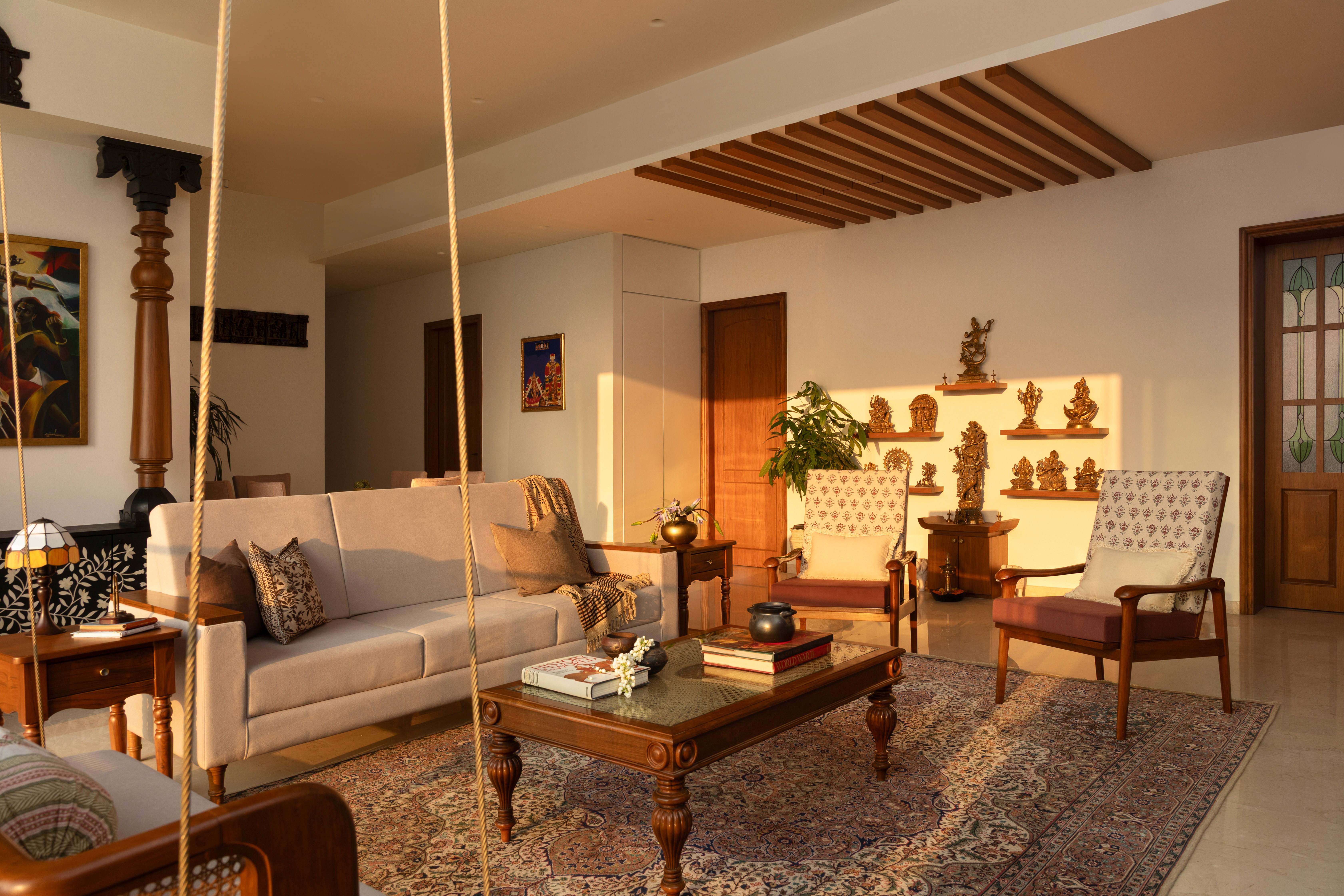 The living room is a showcase of exquisite wooden Indian craftsmanship with the repurposed Chettinad columns mounted on a customised bone inlay crockery unit from Jodhpur being the highlight of the space. Thoughtfully curated teak furniture with intricate carvings combined with cane and brass accents create a warm space that takes you back in time.