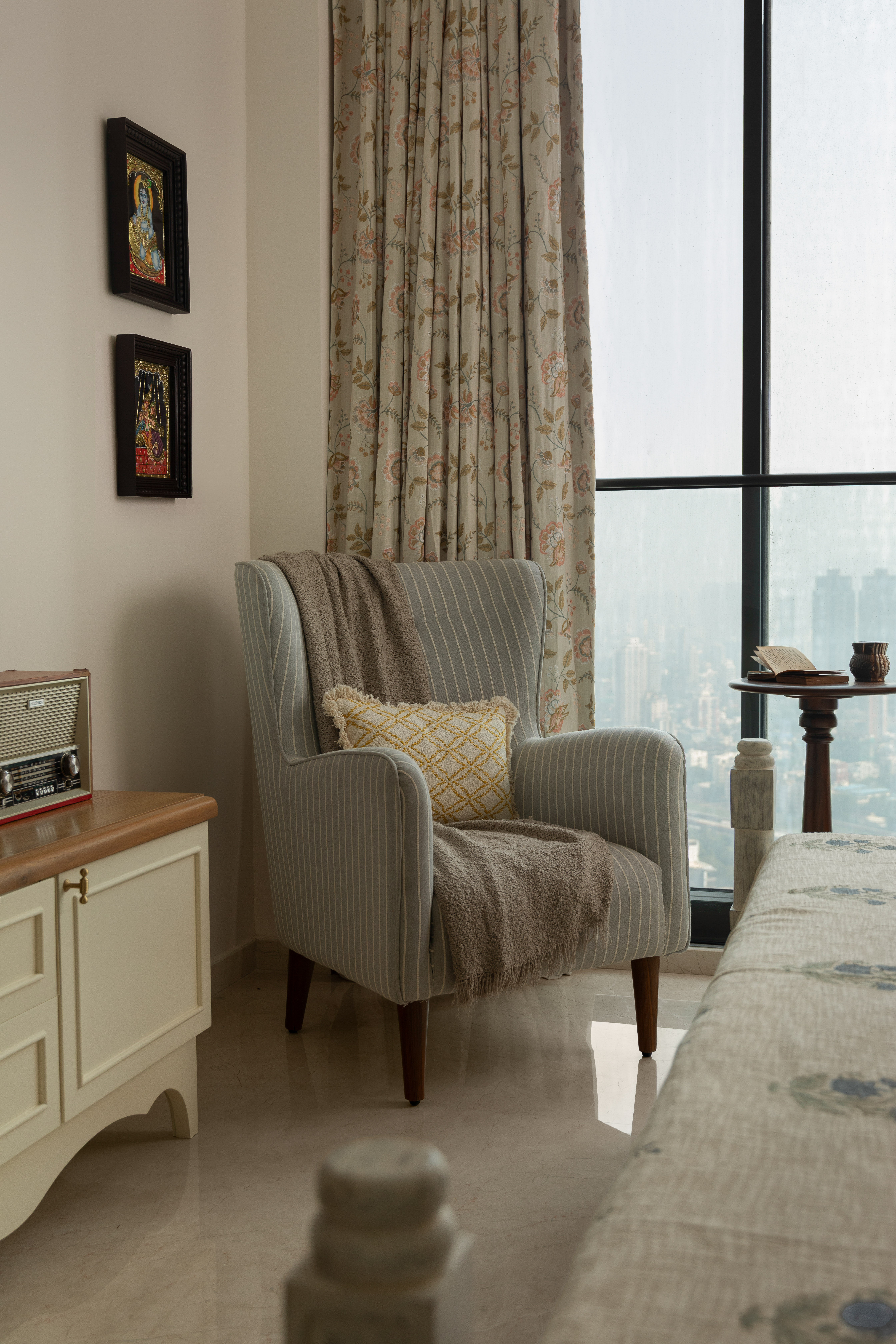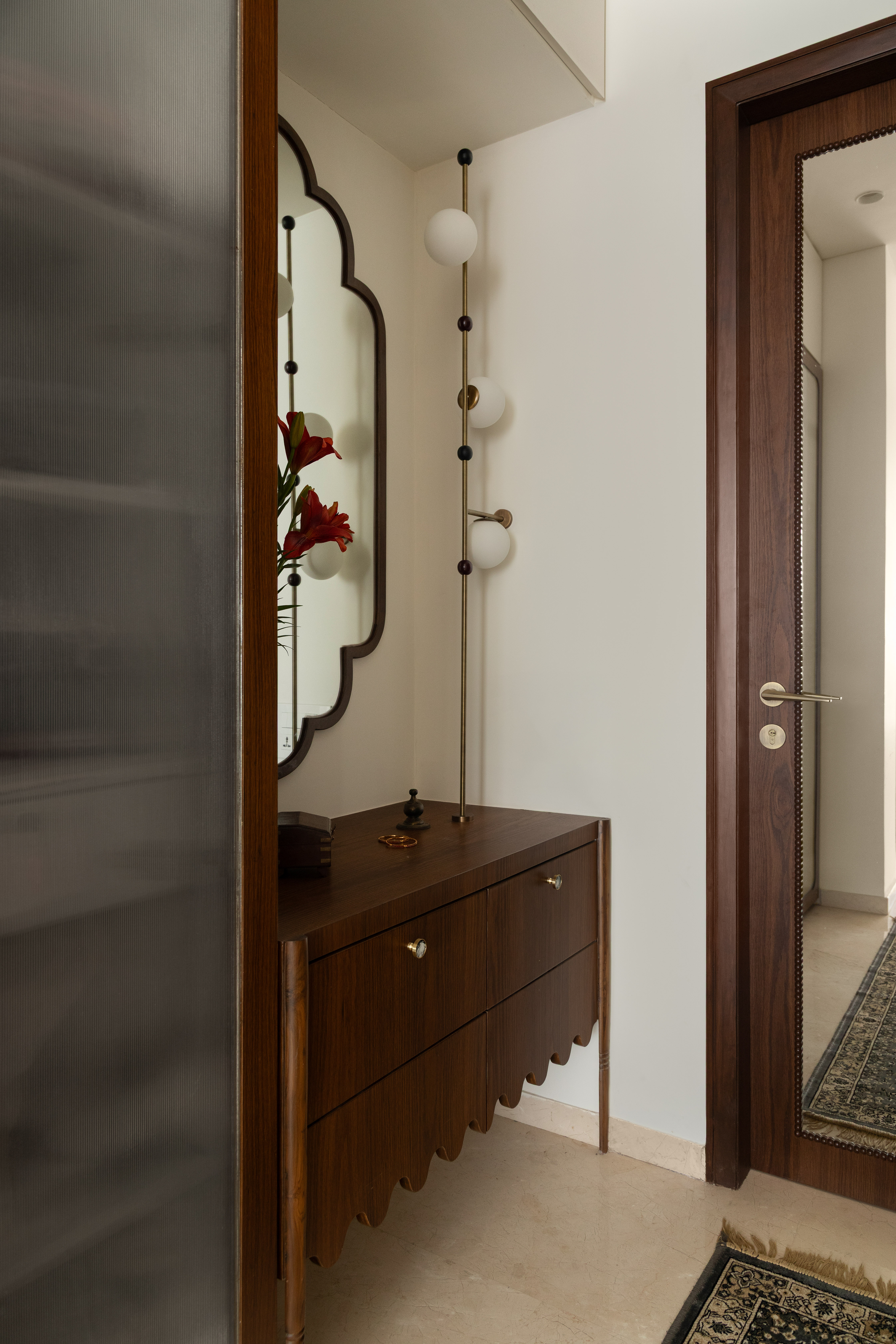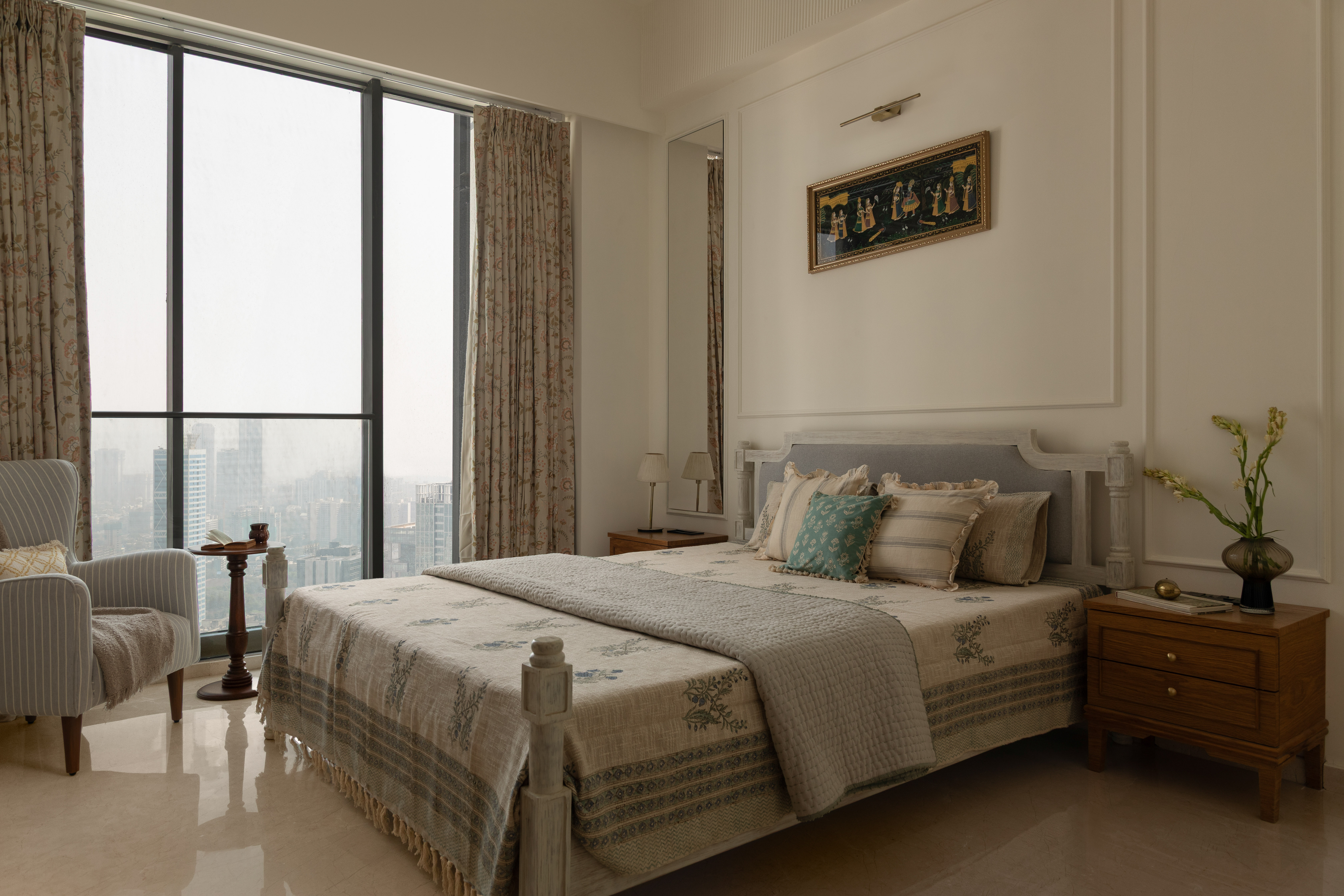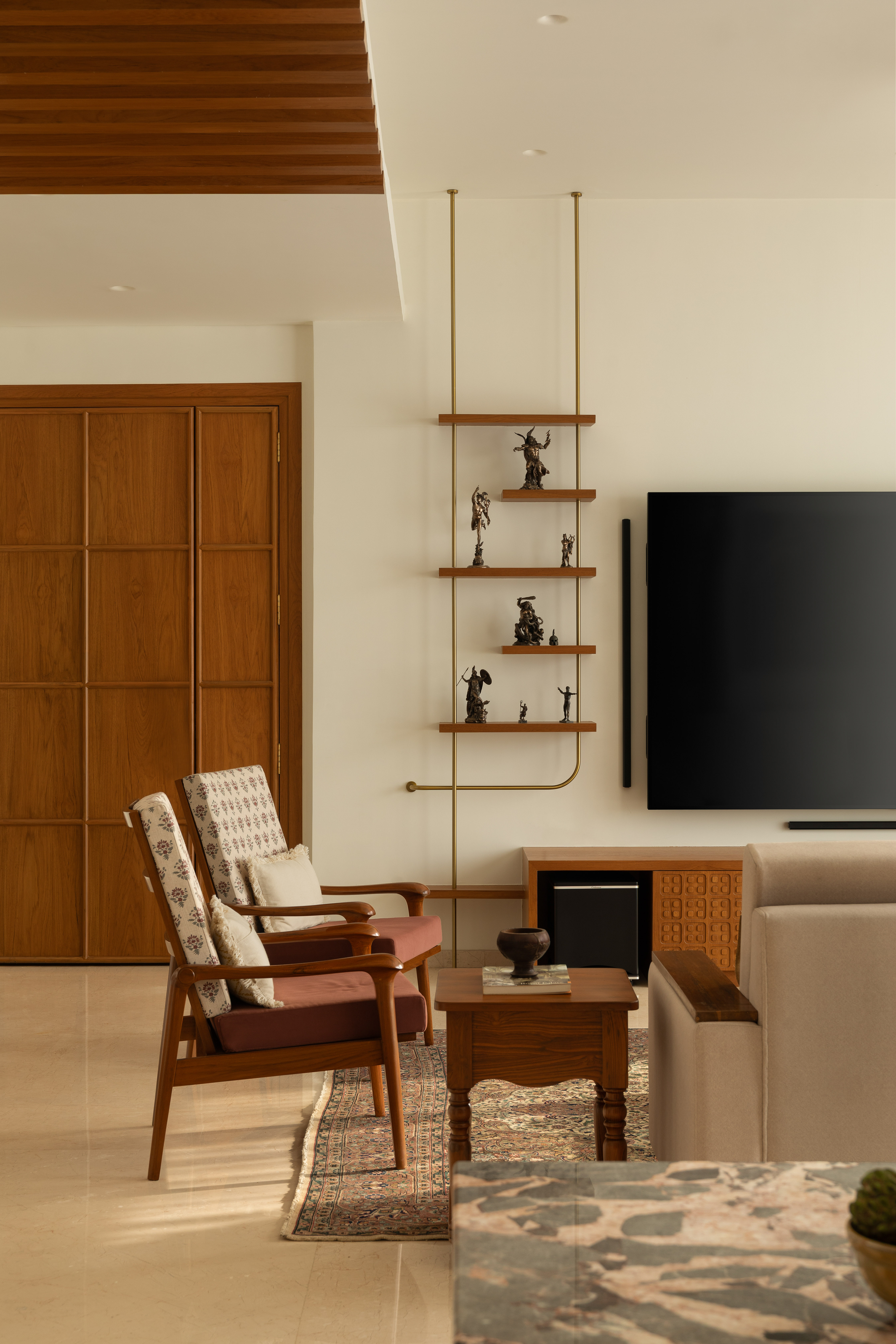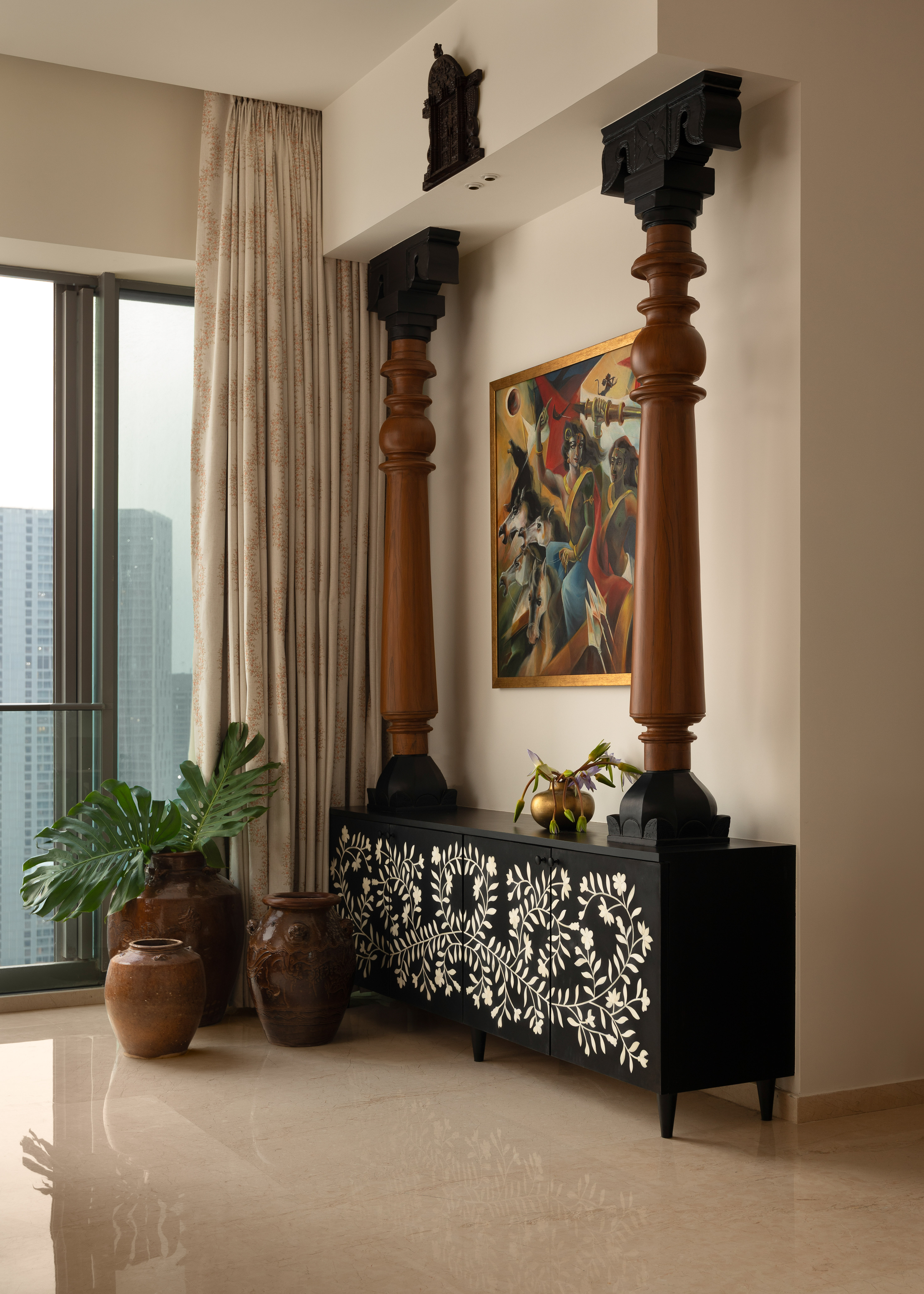 Perched on the forty seventh floor of a high rise in the heart of Mumbai, is a lavish yet rooted home for a Tamilian couple in their early 60’s with a keen interest in history, travel and the arts. Large windows with a stunning view of the sea, abundant natural light and high ceilings served as the perfect opportunity to design a home with a rich wooden aesthetic that gives a homely yet grand feel.