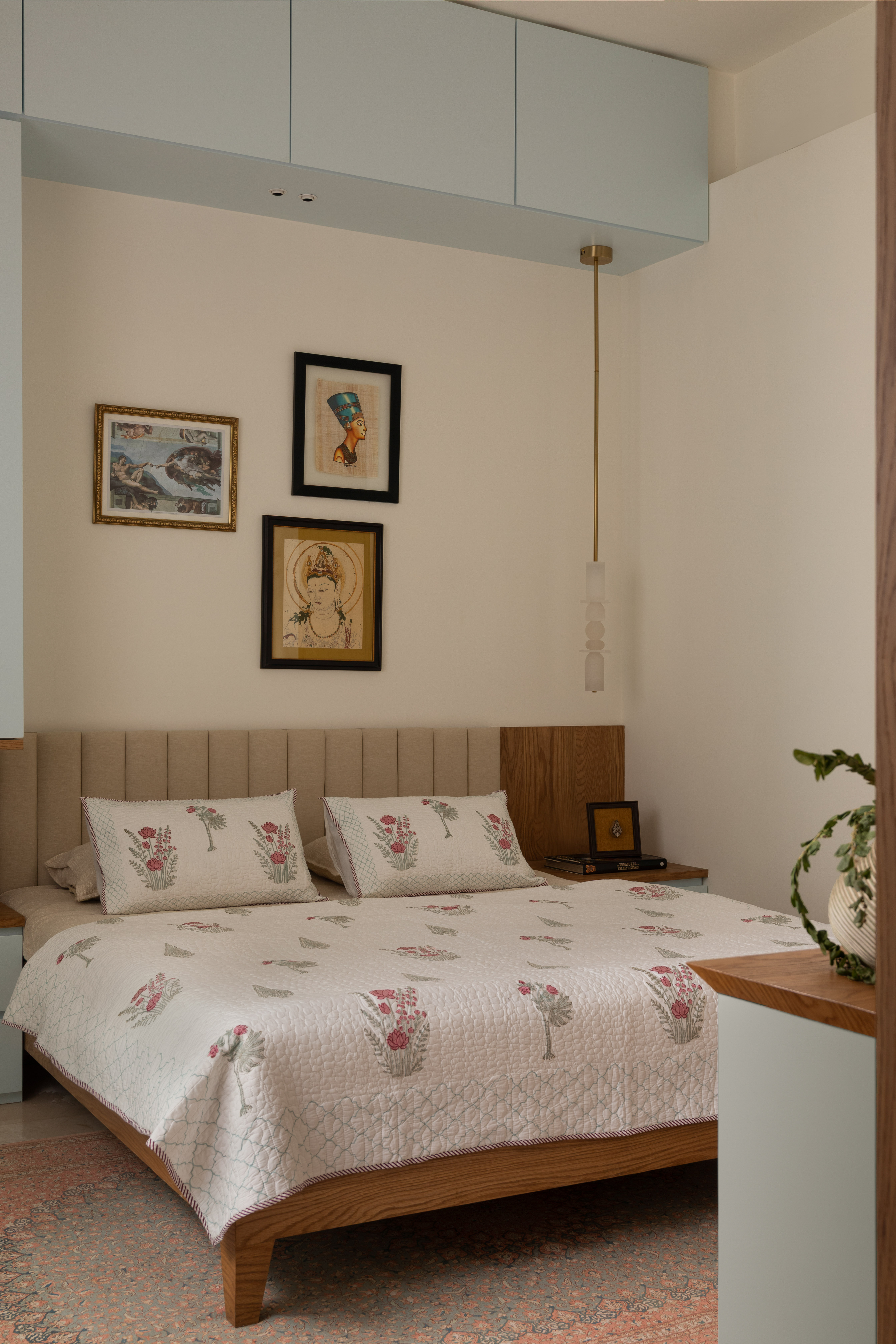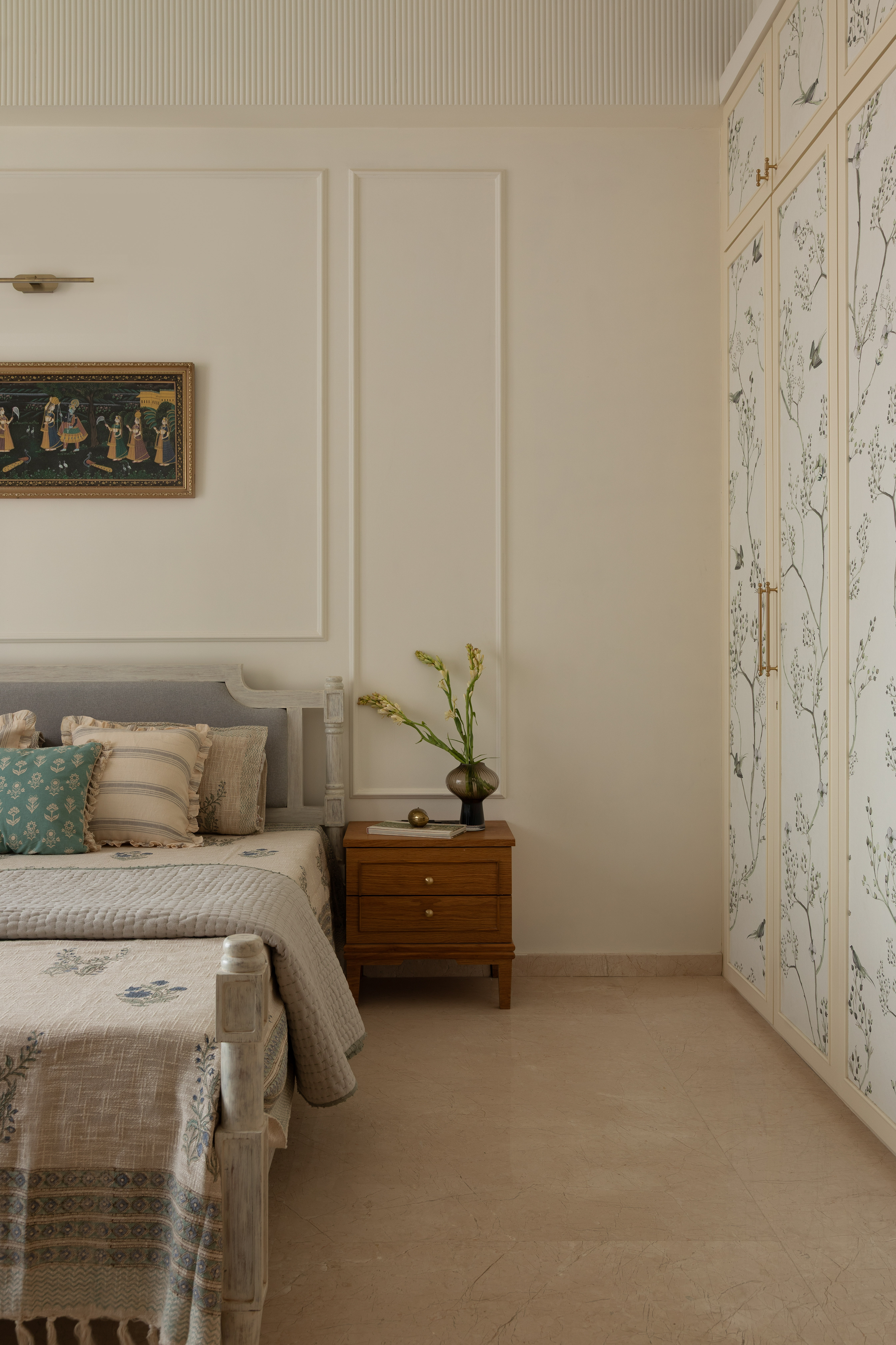 The home branches out into two other bedrooms, both of which have calm and soothing presence, where pastel hues with traces of wooden finishes and neutral soft furnishings create intimate, peaceful settings enabling the family to give their guests warm private spaces to retire into.