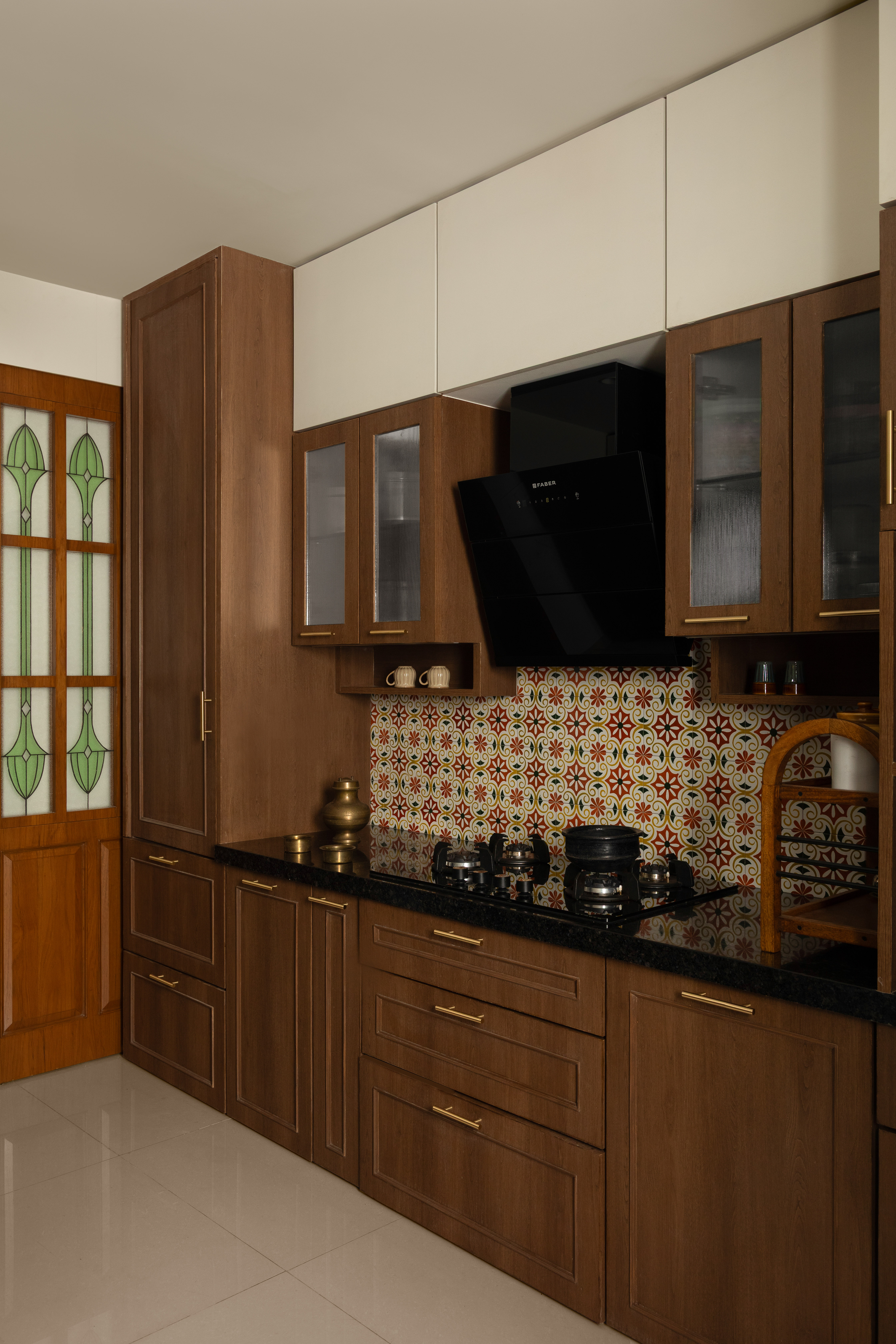 The hand painted Ceramic tiles paired with teak-toned shutters lend an earthy, grounded feeling to the Kitchen; perfect for a couple who is passionate about cooking daily delicacies staying true to their roots.