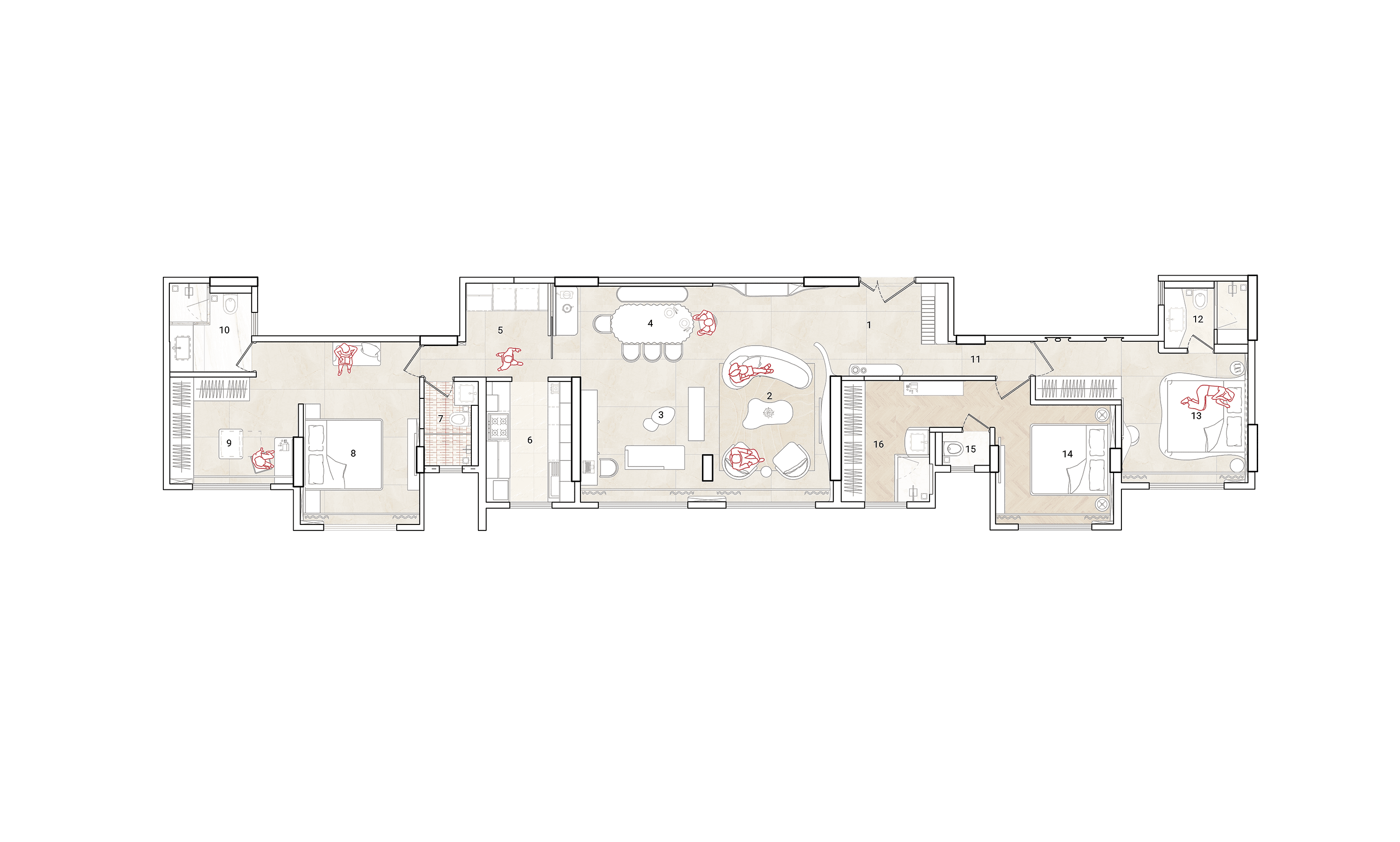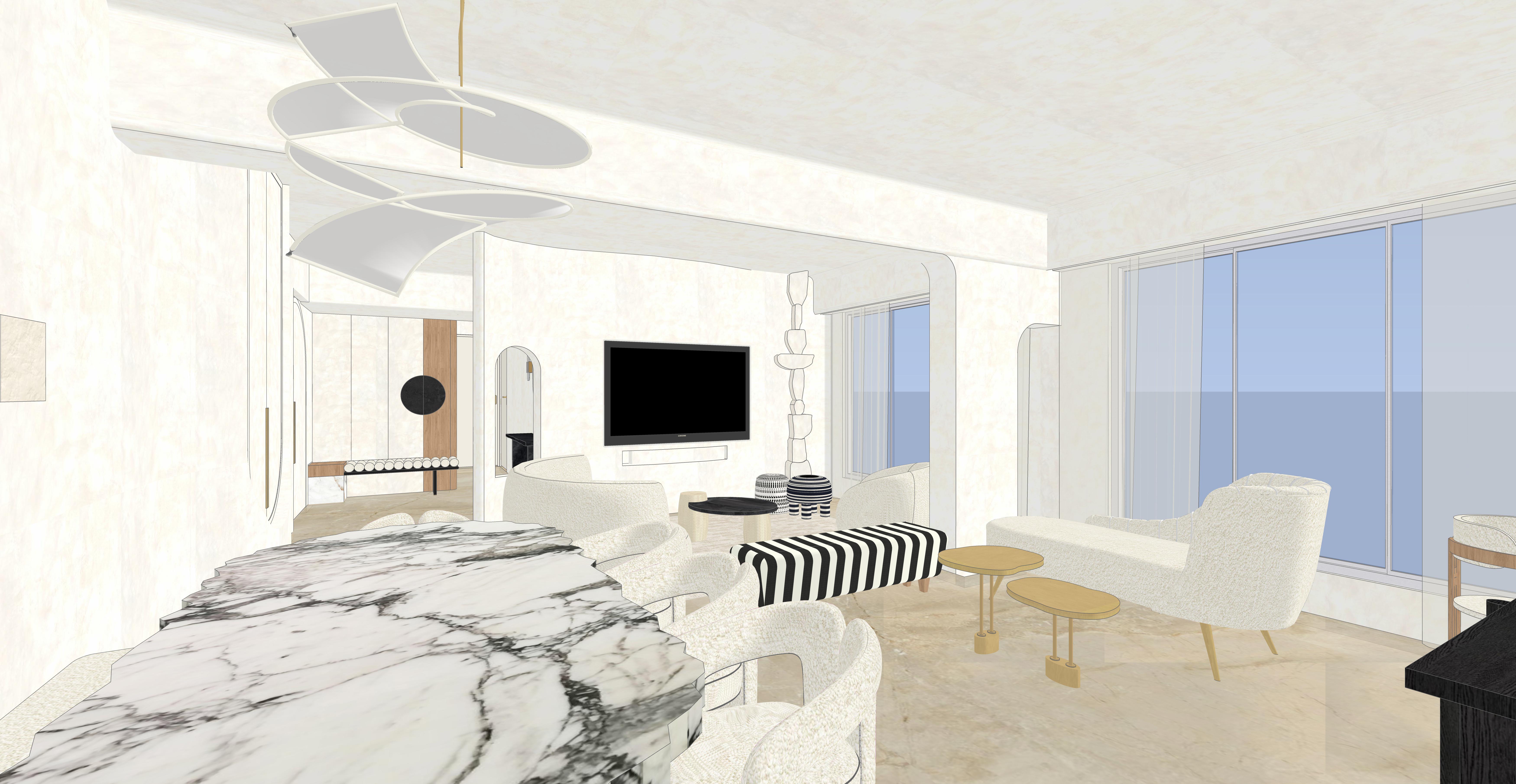 the desire for an elegant space that serves as a haven of peace and tranquility. By combining two adjacent apartments, the layout was reorganised to give the clients a home with lavishly sized rooms, personalised walk in wardrobe areas, a spacious yet cohesive kitchen and utility area and an expansive yet cozy living room that serves as an ideal spot for the family to spend time together.
