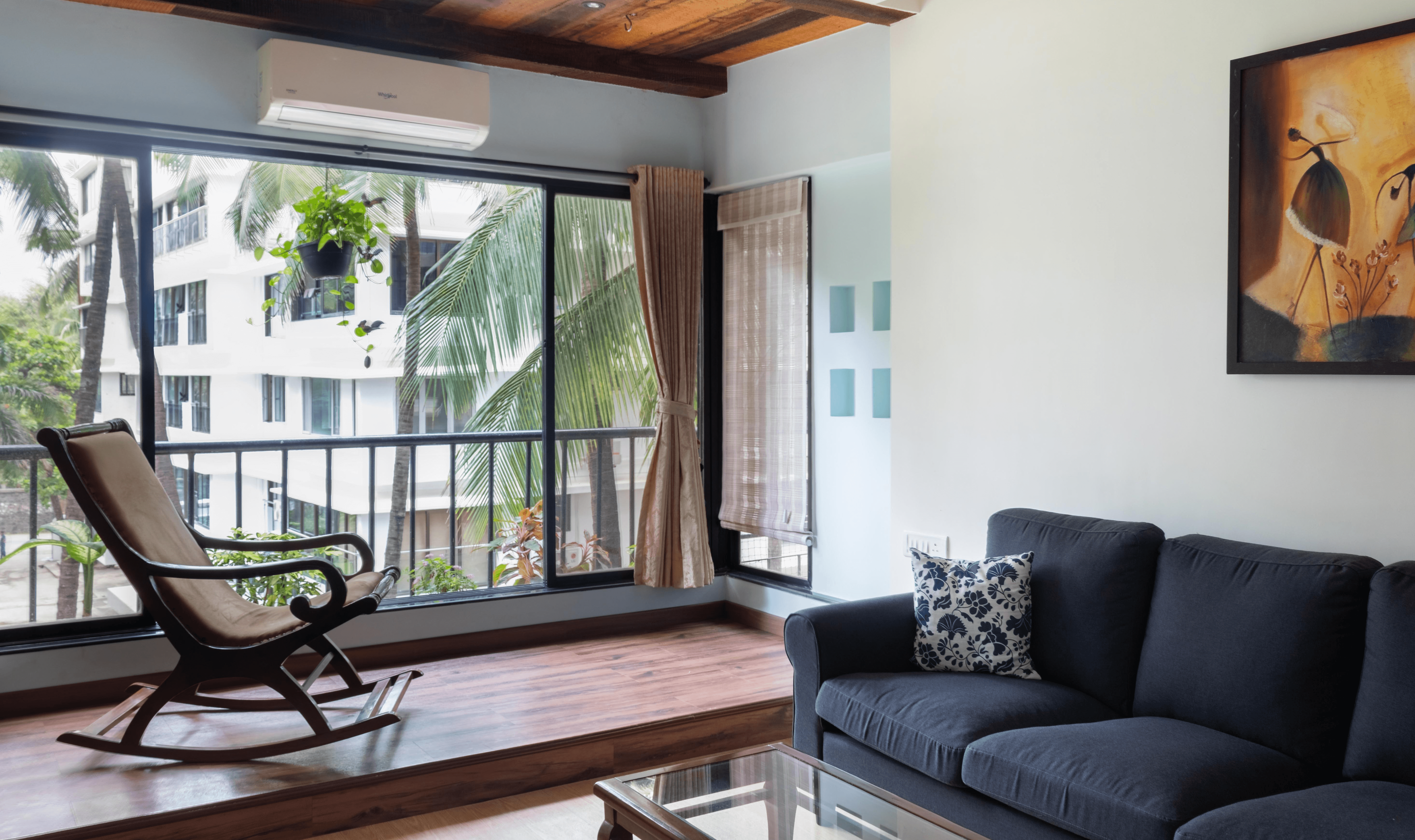 With a beautiful view of greenery from the living room, a balcony like set up with wooden finishes was created, behaving like an “in between space,” one with a nostalgic feel, that serves as a bridge between the inside and the outside.